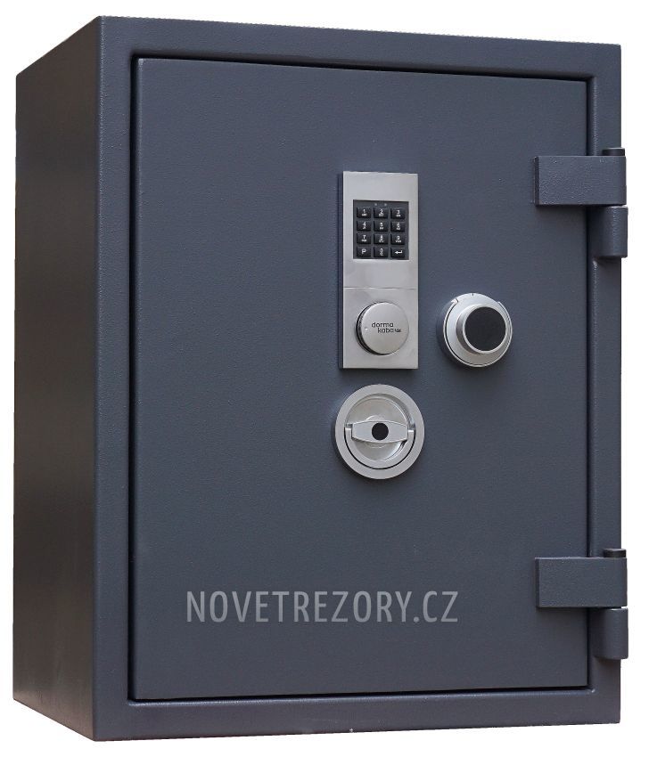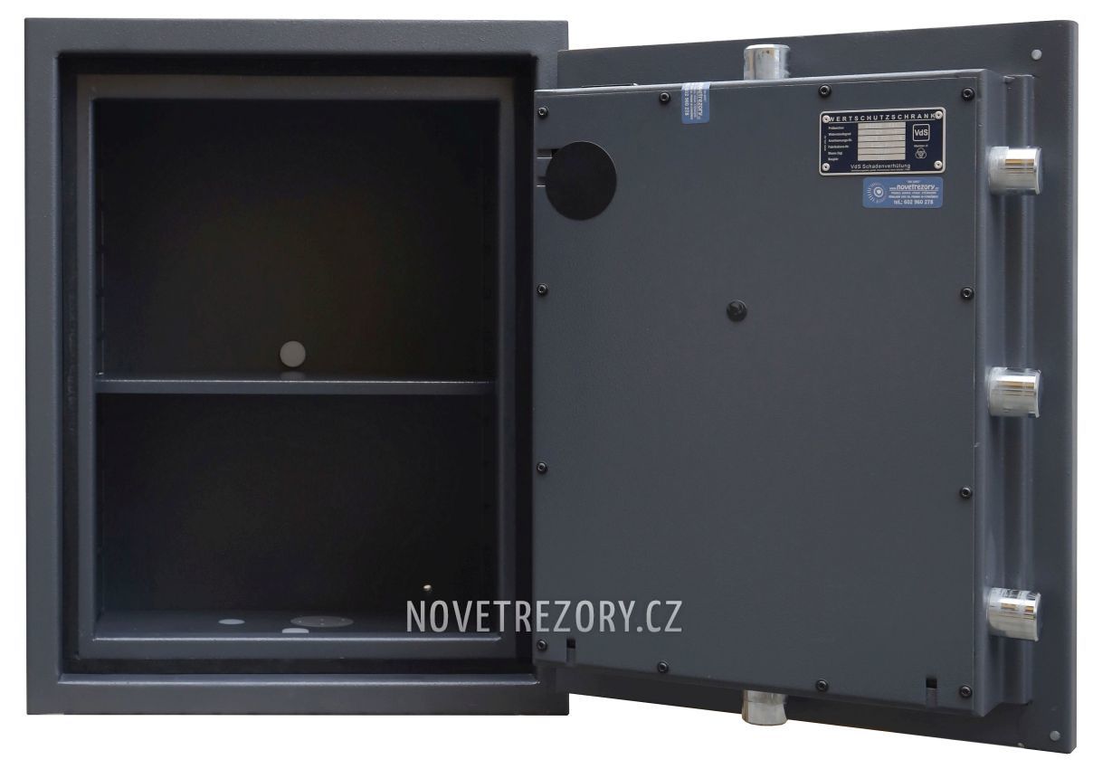 Kvalitně postavený a nadstandardně vybavený trezor německé moderní konstrukce se zaručenou ochranou 80 / 120 RU proti útoku nástroji s mechanickými a termickými účinky. Třístranné centrální zavírání na dveřích doplněné na straně závěsů masivním pevným uzávěrem. Hloubkově chromované zamykací čepy nadstandardního průměru 40 mm. Vnější panty pro plné otevření dveří a možnost vysazení při stěhování. Dodatečné ochrany rozvorového mechanismu proti termickému a mechanickému napadení. Příprava na připojení do systému EZS. Zde s příplatkovým elektronickým zámkem s možností nouzového otevření klíčem a řadou funkcí včetně možnosti nastavení časového zpoždění, přístupu 4 očí atd. Ohnivzdornost 30 minut a vnitřní schránka za příplatek. Celková hloubka včetně pantů 44cm. Elitní výrobek III.BT.