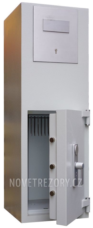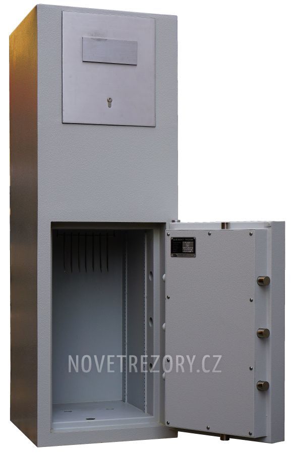 VELKÁ SLEVA !! Bytelný, certifikovaný trezor s vhazovací nástavbou. Určen pro ukládání vyšších hotovostí. Bezpečností třída III.BT EN 1143-2 deklarována štítkem i papírovým certifikátem. r.v. 2008 ..Málo používaný. Technicky v perfektním stavu. Zkontrolován, vyčištěn, promazán...Osazen novými zámky. Od vhozu 5 klíčů / Hlavní dveře 2 klíče...Za příplatek klíčový zámek nahradit zámkem mechanickým kombinačním + 4950 Kč bez Dph, nebo elektronickým + 7950 Kč bez Dph). Příprava pro polici. Za příplatek ( 700 Kč bez Dph) můžeme vyrobit. Bytelná konstrukce dveří i korpusu vyplněné betonem. Přesné slícování, pancéřovaný třístranný uzamykací systém. Dodatečná pasivní blokace rozvorového mechanismu při termickém či mechanickém napadení. Vnitřní šíře v místě přestavitelných žebříčků : 35cm. Velikost vhazovacího otvoru : 180 x 55 mm. Zadní pravý roh (bok a záda) poškozené od neodborného stěhování v minulosti (poslední foto). Nemá žádný vliv ani na funkčnost, ani bezpečnost trezoru. Záruka 12 měsíců.