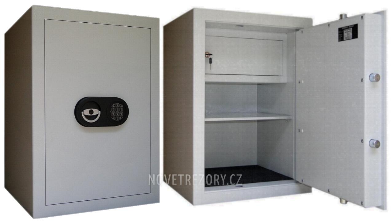 Perfektní poměr vnitřního prostoru a ceny. Ohnivzdorná výplň stěn i dveří. Kvalitní, hluboko uložený - elektronický certifikovaný zámek se samostatně ovládaným třicestným rozvorovým mechanismem. Baterie přístupná z klávesnice. Možnost nastavení časového zpoždění a 2 kódů. Čelní plát dveří síly 8mm. Uložení šanonů na výšku pod schránkou i na šířku. Certifikace trezoru vyhovuje pro uložení zbraní v počtu do 10ti kusů. NEDOSTUPNÉ