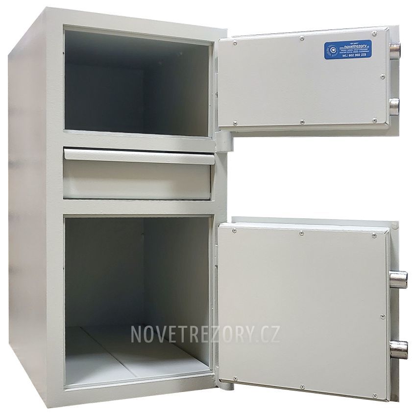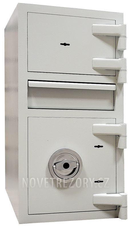 Zajímavě řešený, kombinovaný vhozový sejf. Samostatná horní část - 1 zámek. Předmět vhozený přes vhazovací klapku propadná do spodní části sejfu. Další odlišností tohoto provedení je tzv. přístup 4 očí. K otevření spodní části je potřeba použít současně dva různé klíče. Kvalitní certifikované zámky německé výroby. 4 silné kotevní otvory v podlaze. Korpus sejfu z 6mm silné oceli. Dvouplášťové dveře, čelní plát dveří síly 10mm. Vnější panty pro plné otevření dveří.