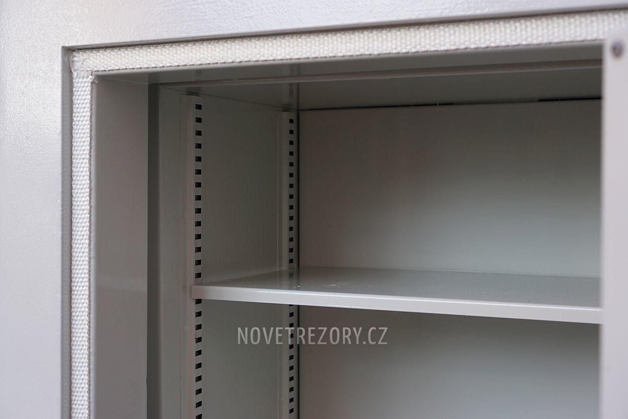Špičkově zpracovaný, volně stojící trezor. Silné dveře, čtyřcestný rozvorový mechanismus, hluboko uložené zámky. Výškově nastavitelné a vyjímatelné police, 2 velkoryse dimenzované kotevní otvory v podlaze. Klíčový zámek + mechanický kombinační zámek. Vysoká protipožární odolnost díky meziplášťovým výplním a přesnému slícování. Trezor jsme osadili novým protipožárním těsněním. Síla stěn 105mm / dveří 135mm.