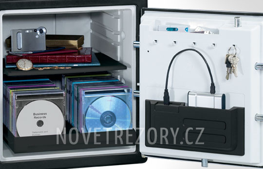 Vnitřní výbava sejfu obsahuje: 5 háčků na klíče na vnitřní straně dveří a malý prostor ve dveřích na ukládání drobných předmětů. CD/DVD organizér pro až 72 CD/DVD včetně obalů.