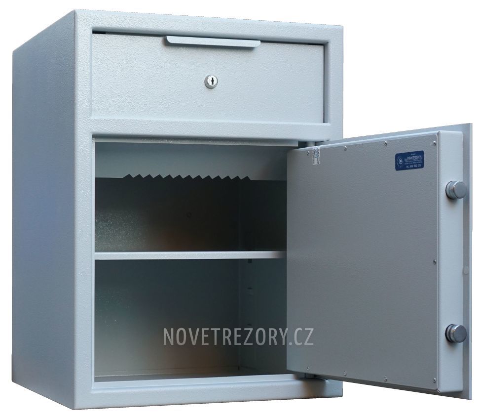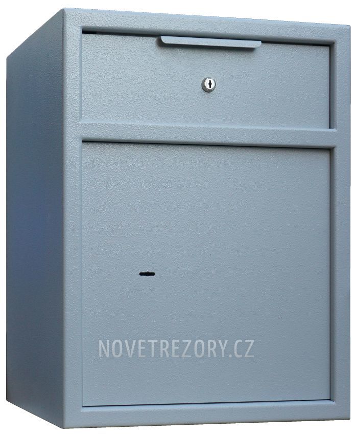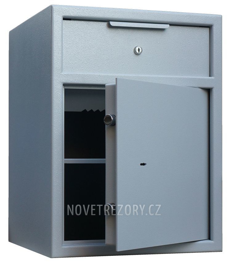 Vhazovací trezor / sejf s překlapávací klapkou vhodný k omezení kumulace vysokých částek v provozovnách typu restaurace, trafiky, sázkové kanceláře, čerpací stanice a všude, kde je jakýkoliv pohyb peněz. Vhodný k dennímu ukládání tržeb. Po vložení hotovosti dojde k překlopení klapky a vložený předmět se propadne do trezorové části, od které má klíč pouze pověřená osoba / majitel. Kvalitní certifikovaný trezorový zámek - 2 klíče. 4 otvory pro montáž k podlaze + 2 předlaserované v zadní stěně. Dvouplášťové, zapuštěné dveře s tloušťkou čelního plátu dveří 5mm. Korpus sejfu síly 3 mm. Nově, s výškově nastavitelnou policí. Velikost klapky: Š:375 mm x cca 100x100 mm. Obdobný model máme skladem i v menším provedení se zámkem na klíč. Posíláme na malé paletě, volte prosím přepravné 50-75 kg.