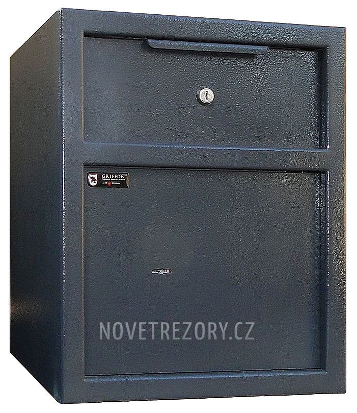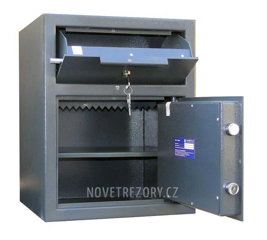 Málo použitý, vhazovací trezor s překlapávací klapkou vhodný k omezení kumulace vysokých částek v provozovnách typu restaurace, trafiky, sázkové kanceláře, čerpací stanice a všude, kde je jakýkoliv pohyb peněz. Vhodný k dennímu ukládání tržeb. Po vložení hotovosti a překlopení klapky se vložený předmět přesune do trezorové části, od které má klíč pouze pověřená osoba / majitel. Proti zpětnému vytažení brání kromě vhazovacího mechanismu i 2 ozubené hřebeny. Kvalitní certifikovaný trezorový zámek STUV - 2 klíče. Laserované dveře síly 5mm. Vyztužený čelní rám. Uzamykatelná vhazovací klapka - 1 klíč (lze nechat přidělat). Promazán, zkontrolován. Záruka 12 měsíců. Originální foto připravujeme