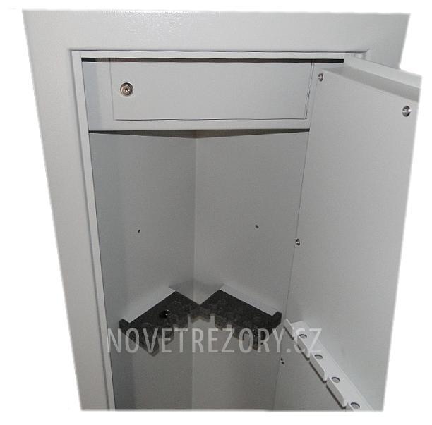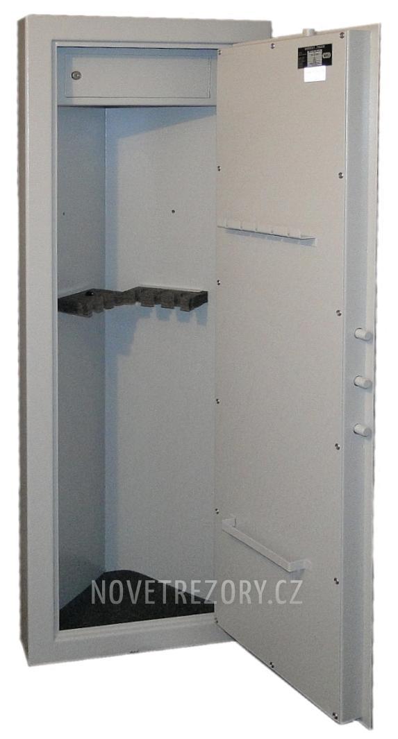 Skříň pro šest zbraní do délky 128 cm. Navržena pro maximální využití rohových prostorů. Vnitřní zamykatelná schránka. Oproti jiným typům zbraňových skříní nejen v této cenové kategorii je tato vybavena vnějšími panty umožňující plné otevření dveří o 180 st. Též samostatné ovládání rozvorů je rysem "dospělých" trezorů. Tato skříň na zbraně splňuje požadavky odolnosti proti vloupání minimálně 15 RU podle ČSN EN 1143-1 + A1:2009 a je vybavena zámkem třídy A podle ČSN EN 1300:2005. Certifikát : ANO Skříň musí být přišroubována. Certifikát 15RU + zámek "A" EN 1300./////// Z DŮVODU COVID-19 JE AKTUÁLNĚ POZASTAVENA VÝROBA. DOSTUPNOST AKTUÁLNĚ NEZNÁME.